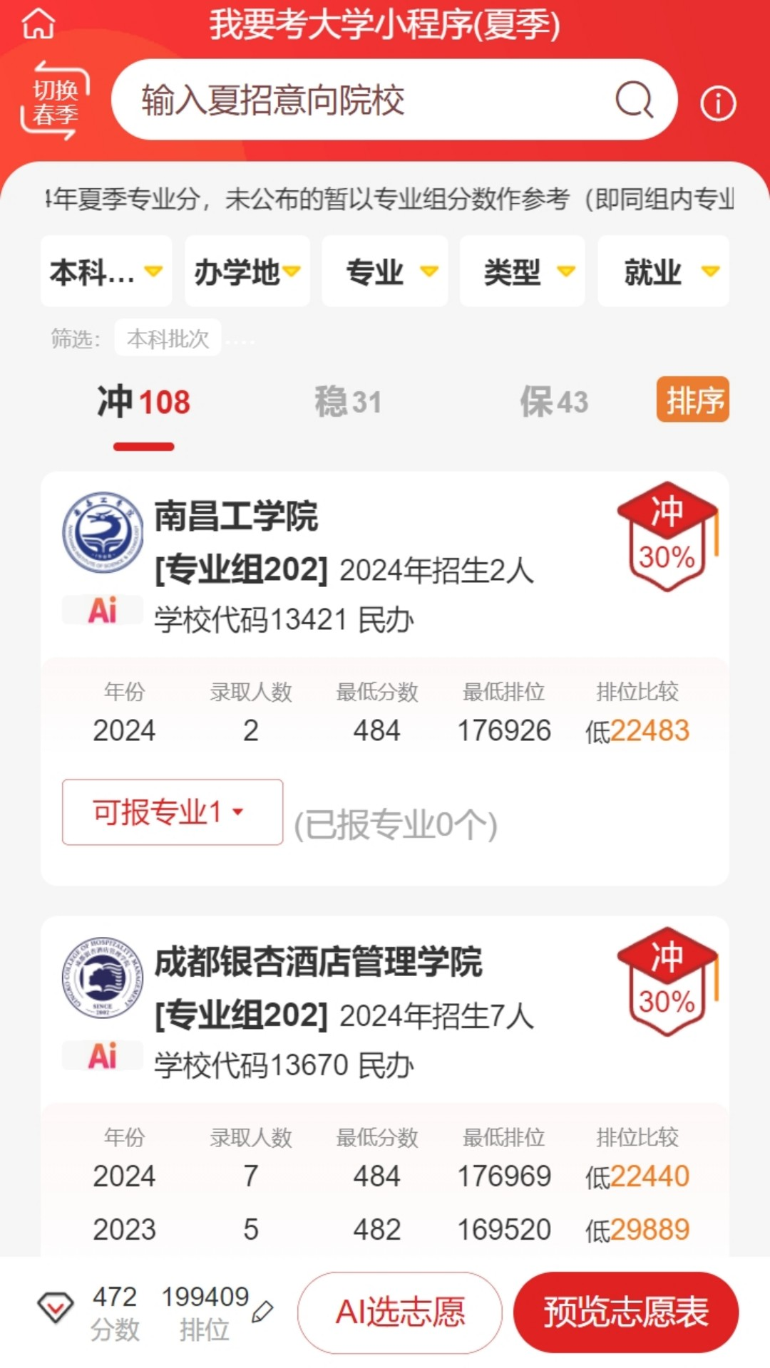输入自己的成绩即可进行分析,推荐合适的志愿以便查看和选择;